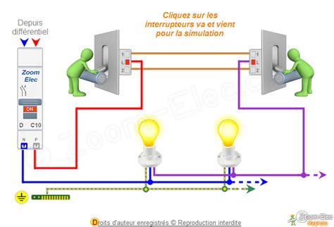Ce contact oriente la tension vers deux bornes. Le câblage sans neutre présente l’avantage d’être facile à installer en rénovation. Schema électrique interactif et principe de fonctionnement d'un va et vient. Les interrupteurs sont vus de l'arrière. Le va et vient permet de mettre sous tension un ou plusieurs points declairage et cela de deux endroits differents.